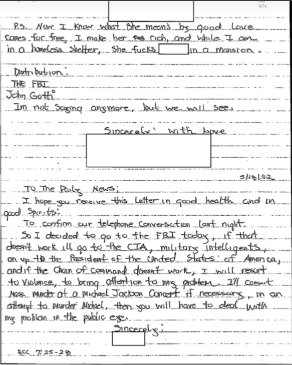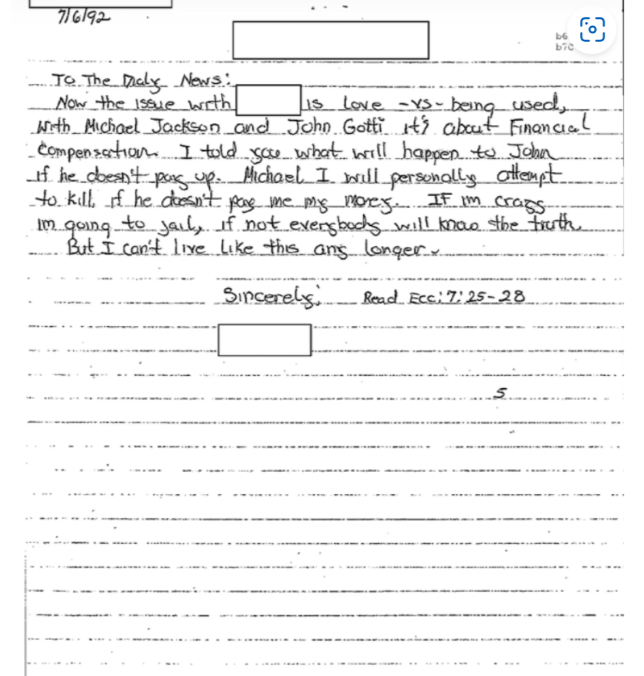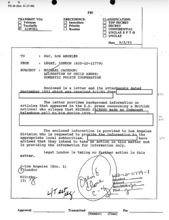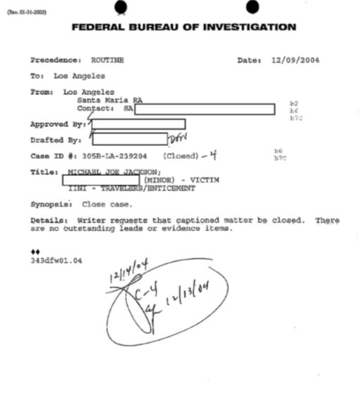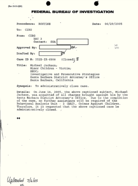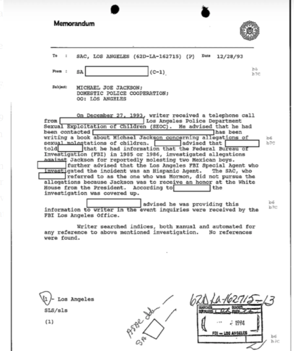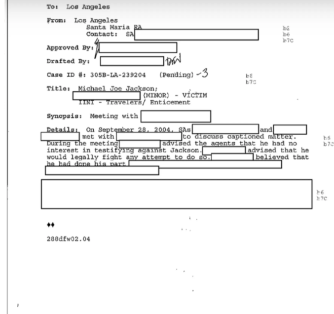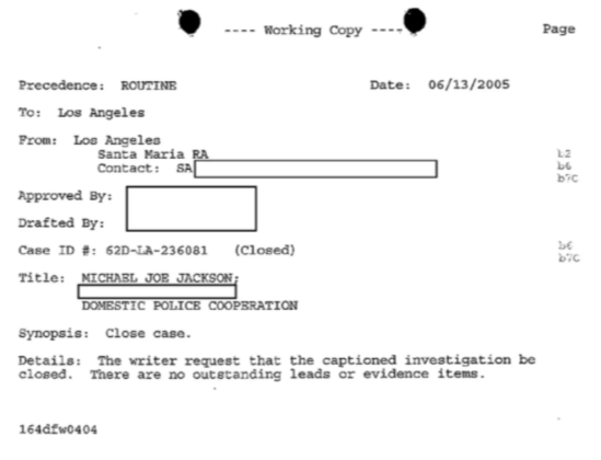 Idemo dalje… FBI-ovi dosjei su se sastojali od više od 600 stranica, od kojih je 351 stranica javno objavljena. Ako napravite brzu računicu, to znači da postoji skoro 300 stranica Jacksonovih FBI dosjea koje nikada nisu bile javno viđene. A s obzirom da te stranice još uvijek nisu predmet javne evidencije u trenutku kada se ovo piše, niko nije u poziciji da kaže da je FBI nešto uradio ili nije uradio, osim ako to nije posebno navedeno u ovim javno objavljenim dosijeima.