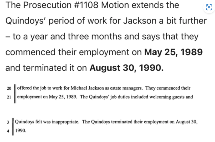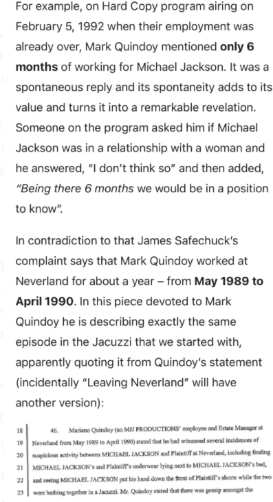 Kao što ovdje vidimo, Mark Quindoy je na Hard Copy-u u februaru 1992. godine (što je bilo dugo prije optužbi, usput rečeno) naveo da je radio šest mjeseci, ali u optužbama Jamesa Safechucka, koje su uslijedile godinama kasnije, period Quindoyeve zaposlenosti je produžen do aprila 1990. godine, dodajući nekoliko dodatnih mjeseci onome što je Mark prvobitno tvrdio na Hard Copy-u. Oba ta vremenska okvira proturječe periodu zaposlenja koji je tužilaštvo navelo u svojom prijedlogu iz 2004. godine tokom predsuđenja Jacksona za optužbe vezane za pšorpdicu Arvizo, u kojoj se navodi da su Quindoyevi prekinuli svoj radni odnos sa Jacksonom u avgustu 1990. godine.