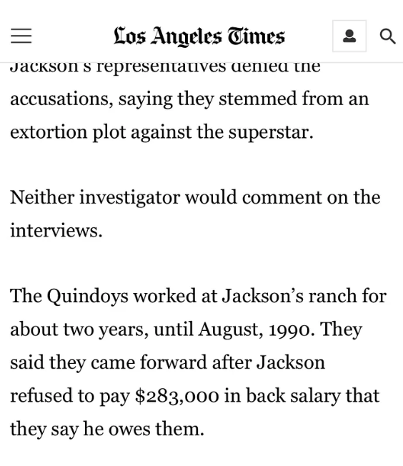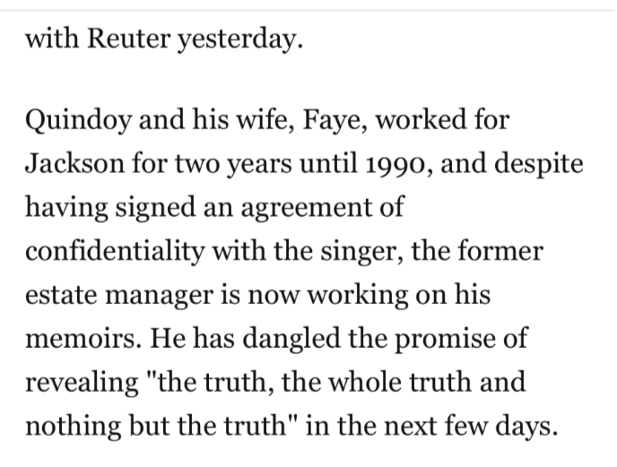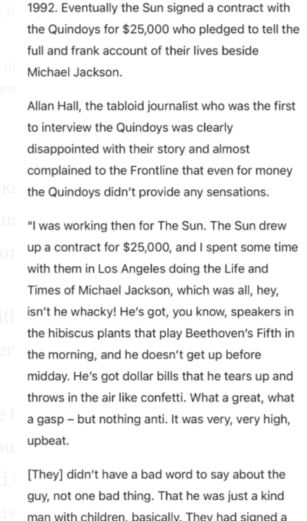 Štaviše, kako je primijetio Vindicate MJ, Quindoyevi će na kraju potpisati ugovor sa The Sun za 25.000 dolara, što znači da su već više od godinu dana prije optužbi prodavali priče o Jacksonu tabloidima.