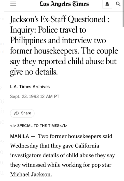 Sada pogledajmo pobliže vremenski tok promjene stava Quindoyevih. Članak Los Angeles Timesa iz septembra 1993. izvjestio je da su Quindoyevi dali intervju nekoliko dana ranije, u kojem su navodno tvrdili da su svjedočili „zlostavljanju“ dok su radili za Jacksona: