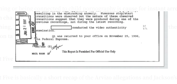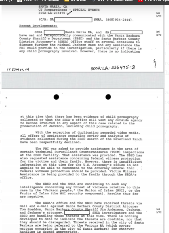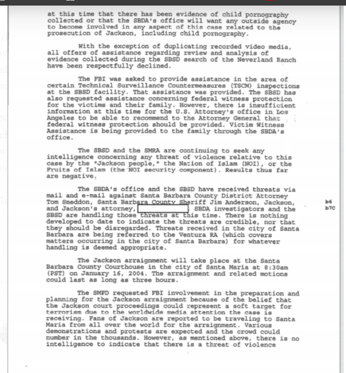 Ovdje možete ponovo vidjeti da nije pronađena dječija pornografija protiv Jacksona. Također, vidite da je FBI odbio da pogleda bilo koji drugi dokazni materijal osim video medija, tj. računara/kompjutera i tvrdih diskova koji su spomenuti ranije, te da je od njih traženo i da pruže Tehničke protumjere nadzora (TSCM) za Šerifov ured Santa Barbare (SBSD), što su prihvatili. Međutim, smatrali su da nije bilo dovoljno dokaza da bi se Arvizo obitelj stavila pod federalni program zaštite svjedoka, što iskreno govori sve o tome šta su mislili o slučaju protiv Jacksona. Jer, da su vjerovali da Arvizo obitelj ima i trunku kredibiliteta koja bi mogla dovesti do osuđujuće presude za Jacksona, ne bi imali problema s pružanjem tog dodatnog sloja zaštite za njih.
